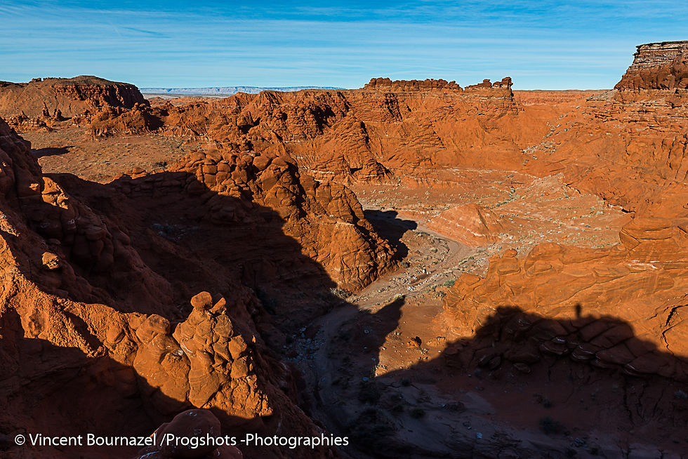 Situées en territoire Navajo, à proximité de Cameron, la zone d'Aideii Echeii Cliffs contient quelques formations rocheuses tout à fait remarquables et spectaculaires. La zone est extrêmement difficile d'accès, par une piste isolée traversée par de nombreux washs. Il vaut mieux s'y engager avec un 4x4 à toute épreuve et avec suffisamment d'eau et de vivre pour attendre de l'aide en cas de problème...Les conditions de cette piste nous ont empéché d'atteindre la zone Nord, et nous nous sommes "contentés" que de lla zone Sud où se trouvent deux spots spectaculaires : les "Crazy Ducks" que nous avons vu changer de couleur au fur et à mesure du coucher du soleil, et "Eye of the Needle" dont nous avons profité au contraire au sunrise...La zone à proximité que nous avons explorée, nous a permis d'approcher un bel hoodoo au sommet arrondi que j'ai modestement baptisé "Progshots Hoodoo", n'en ayant sauf erreur bien sûr, encore jamais vu de cliché .. :-) !